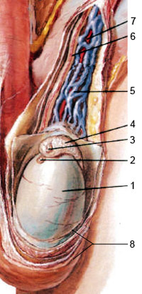 1-яичко 2-привесок яичка 3-привесок придатка яичка 4-придаток яичка 5-венозное гроздевидное сплетение 6-семявыносящий проток 7-артерия яичка 8-оболочки яичка |